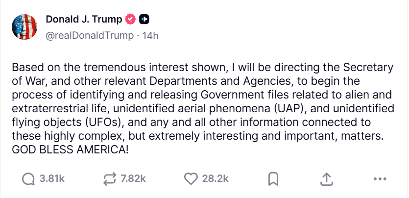 Hace mención a un "tremendo interés" y al Secretary of War, Pete Hegseth, y habla de desclasificación de los archivos relativos a "vida extraterrestre". Esto no son los eufemismos de "fenómenos aéreos anómalos". Si un tío dice que va a sacar los archivos que se refieren a extraterrestres, entonces supongo que es porque los tiene. Aquí hay un cambio de tono bastante demoledor.